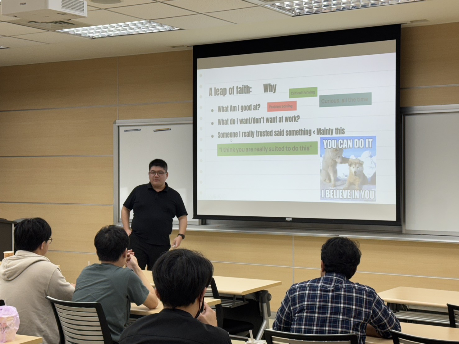 We invited an external expert, Mr. Joseph Shieh, whose academic background was not in IT — he actually studied diplomacy. Yet through self-discipline, consistent effort, and perseverance, he successfully transitioned into cybersecurity and built the career he dreamed of.