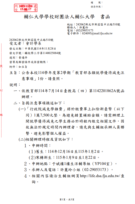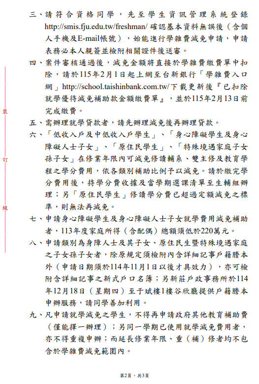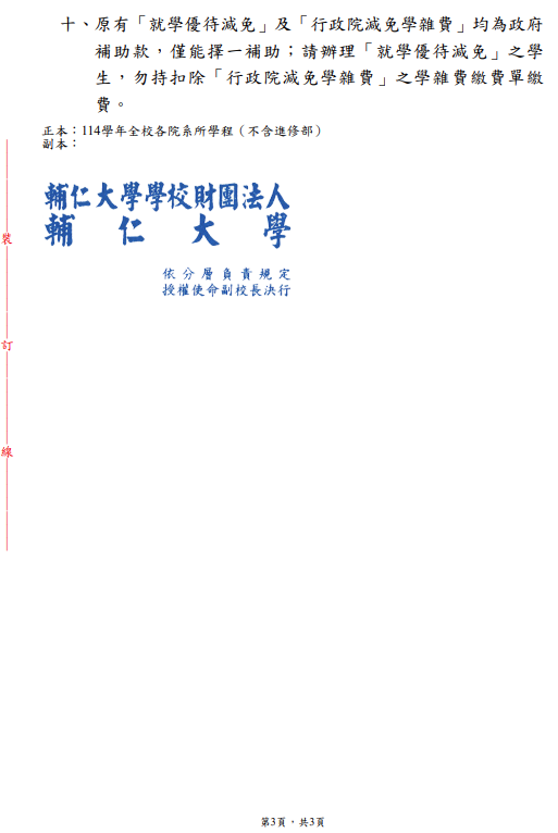 公告本校114學年度第2學期「教育部各類就學優待減免注意事項」1份 (詳最下方檔案下載)