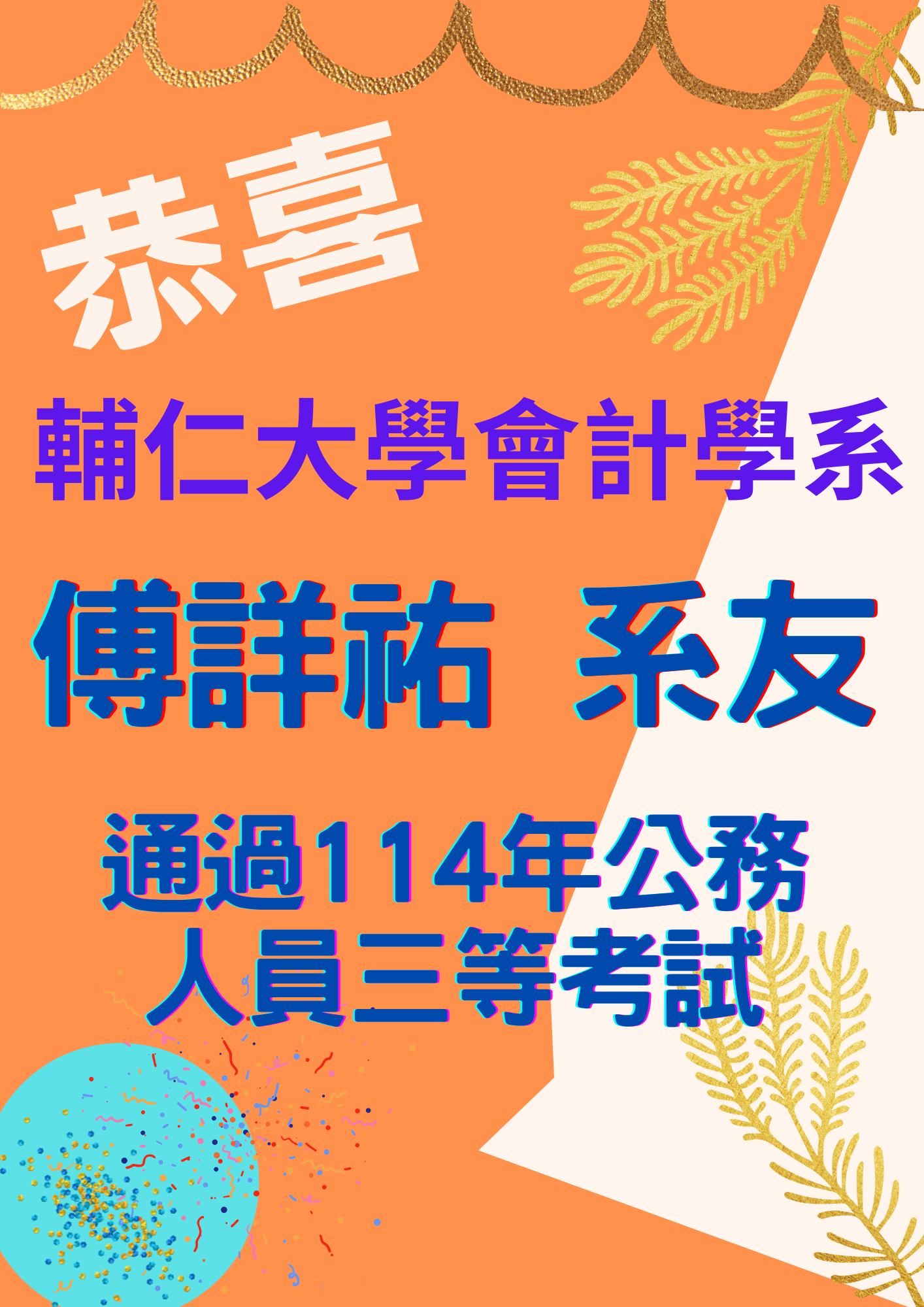 [恭賀] 會計學系傅詳祐系友通過114年公務人員三等考試