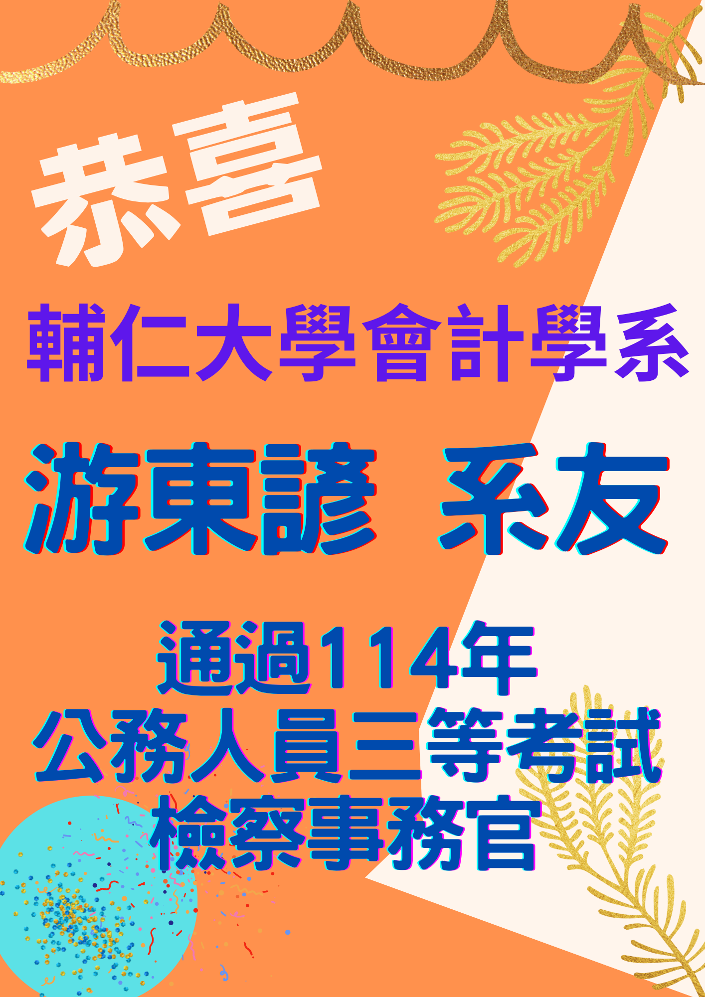 [恭賀] 會計學系游東諺系友通過114年公務人員三等考試檢察事務官