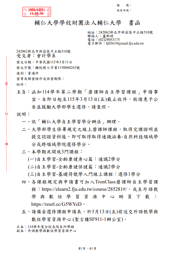 各課程規定與申請書可加入TronClass磨課師自主學習課程:https://elearn2.fju.edu.tw/course/285281#/