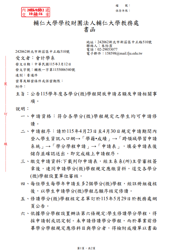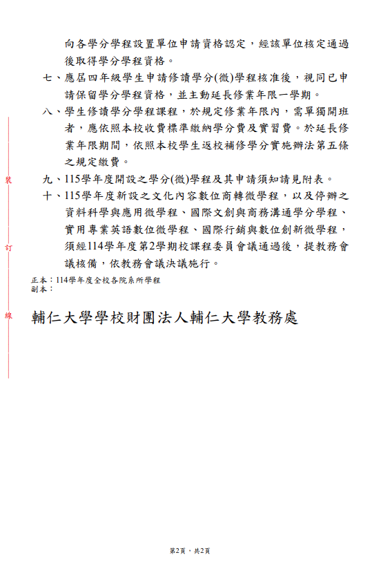 [公告] 115學年度各學分(微)學程開放申請名額及申請相關事項